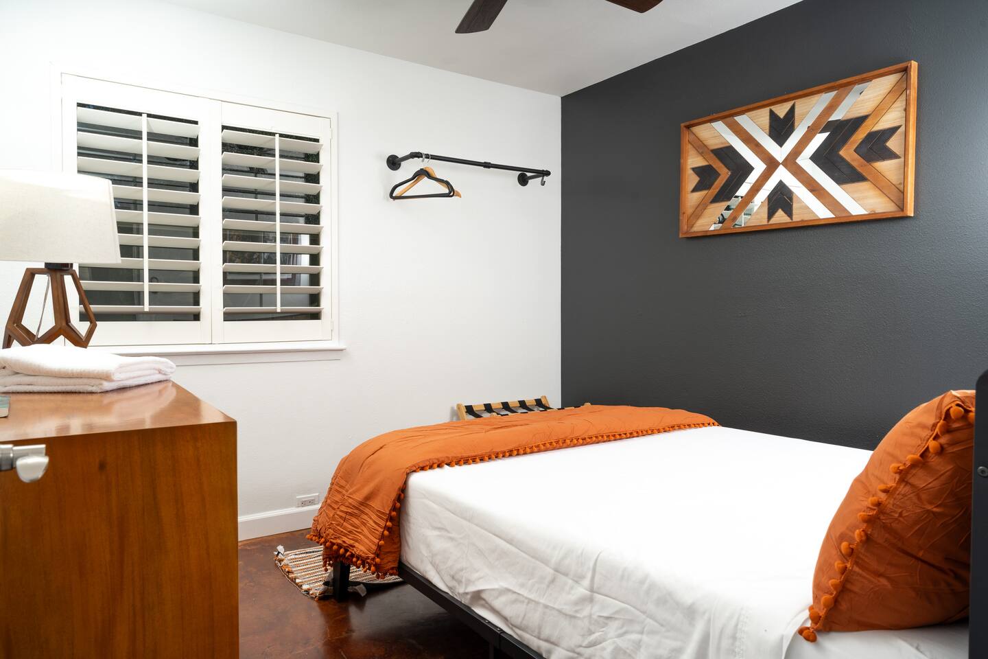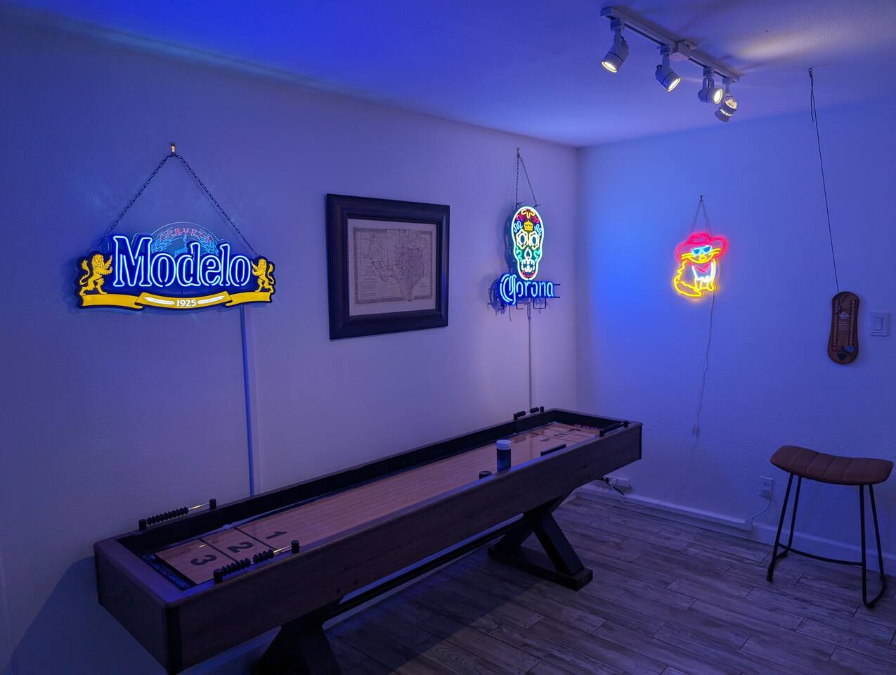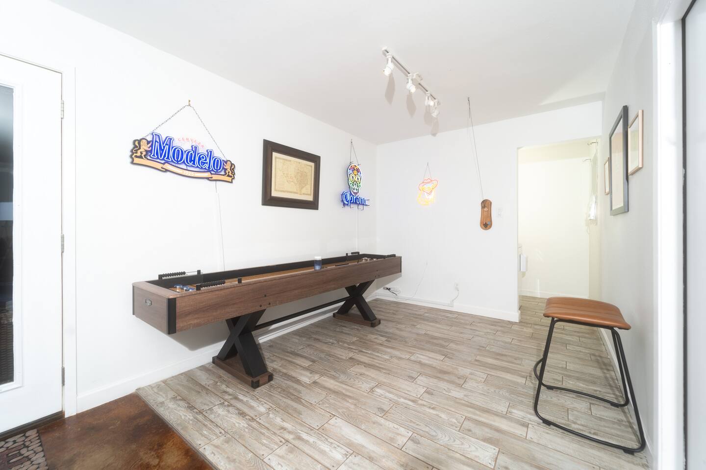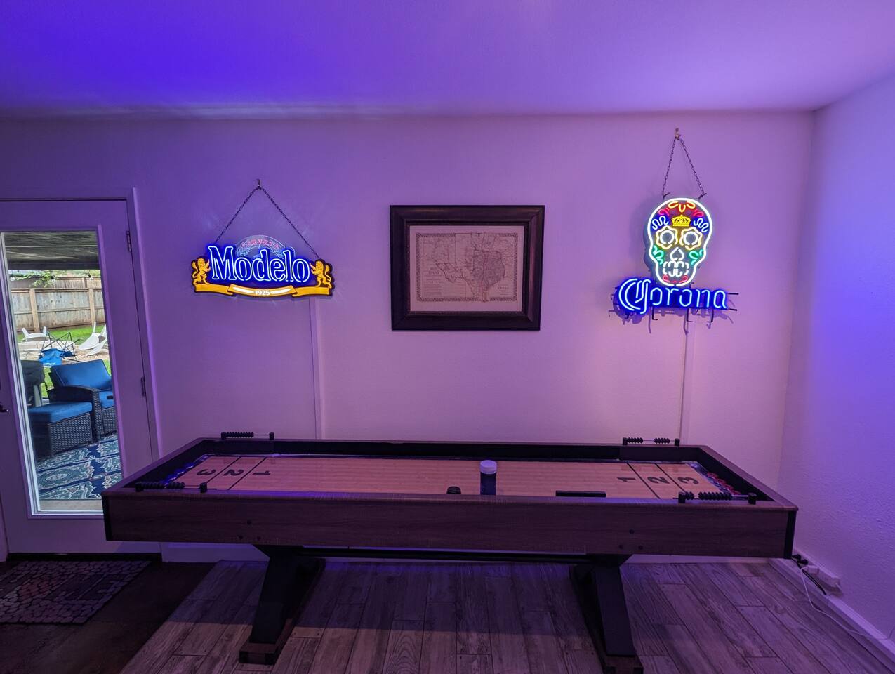 We are ideally centralized in Austin; providing you immediate access to the Domain and Arboretum. They are both a shoppers paradise, and full of dining and nightlife. The home has convenient access to major highways to quickly experience the many sides of Austin. We are 3 min to Austin FC & a short 7-10 min drive south to Downtown, University of Texas, & countless music venues. For Formula 1 lovers, you're a 20 minute Uber to the public transit pickups that you MUST use. To the west and north, quickly find yourself at Lake Travis, Cedar Park Center, Round Rock Express, or Kalahari Resort. Our game room boasts a shuffleboard, ring & hook game, as well as additional table games for you entertainment. Kick back for a movie on a 60" TV and a very comfortable sectional couch. The patio is large with relaxing outdoor living and dining, as well as a steamy hot tub to soak in and destress. The backyard has a built in fire pit and a many large oak trees to provide a peaceful ambiance full of chirping birds and active squirrels year round. The backyard is massive and perfect for your pets to run and enjoy the outdoors. Our space is homey and comfortably designed, with attention to detail. You'll find a fully stocked kitchen and bathrooms complete with all the day-to-day living essentials you may need. You'll sleep great when our memory foam, hybrid mattresses usher you into a deep sleep. The large master is beautifully decorated and set up with a relaxing ambiance. It has a convenient in-suite bath. A second bedroom has been designed with a spacious and well equipped workstation on a stylish wall-to-wall desk for accommodating remote work (laptop connections and monitor). It is also designed for function, as it's equipped with a Murphy bed, providing an open space for activities if needed. The third bedroom will make you feel at home. It is our "Longhorn Room", capturing a vibe of Austin.