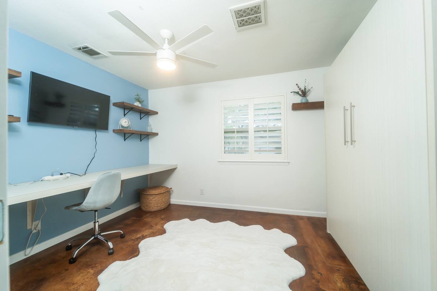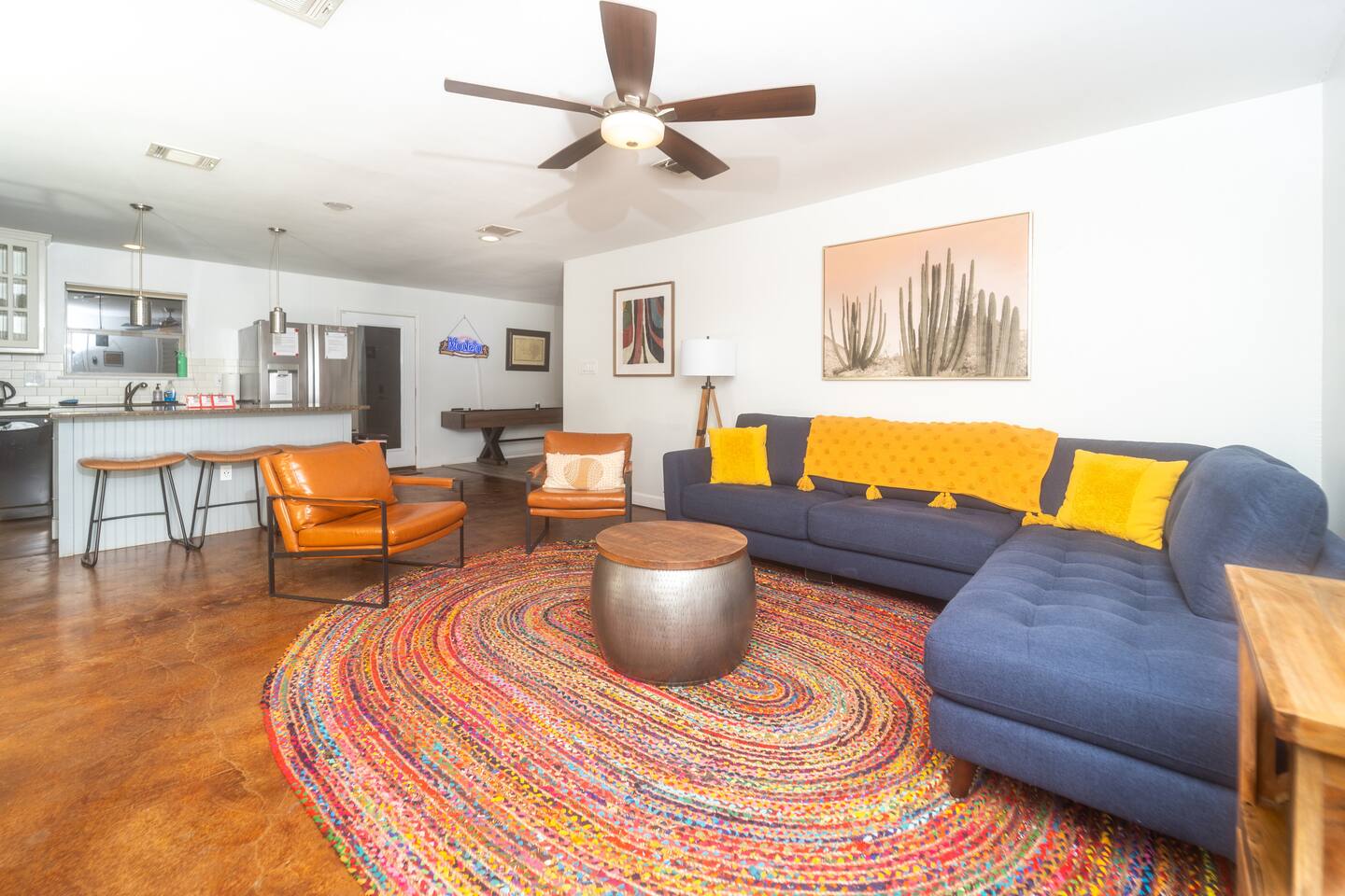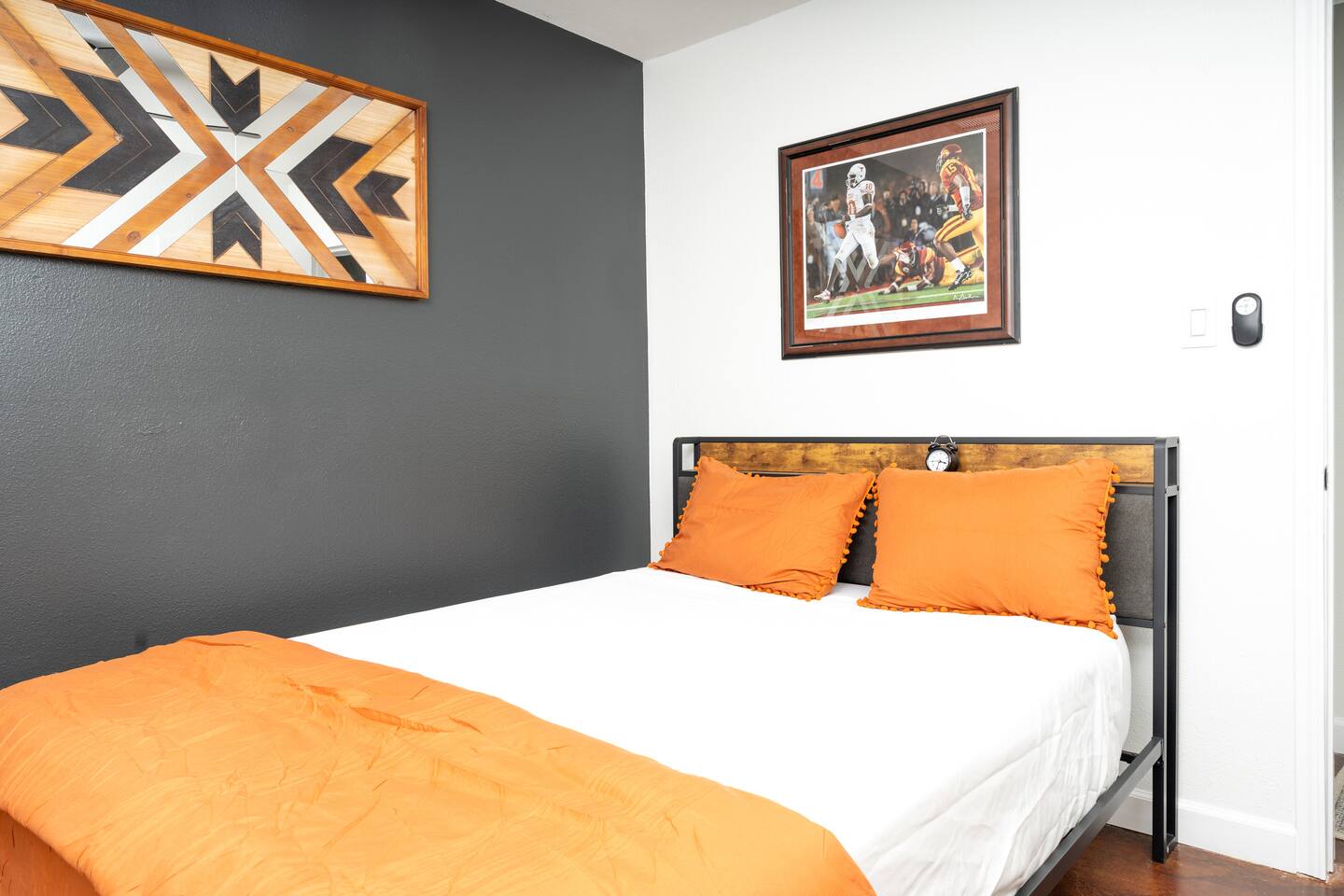 We are ideally centralized in Austin; providing you immediate access to the Domain and Arboretum. They are both a shoppers paradise, and full of dining and nightlife. The home has convenient access to major highways to quickly experience the many sides of Austin. We are 3 min to Austin FC & a short 7-10 min drive south to Downtown, University of Texas, & countless music venues. For Formula 1 lovers, you're a 20 minute Uber to the public transit pickups that you MUST use. To the west and north, quickly find yourself at Lake Travis, Cedar Park Center, Round Rock Express, or Kalahari Resort. Our game room boasts a shuffleboard, ring & hook game, as well as additional table games for you entertainment. Kick back for a movie on a 60" TV and a very comfortable sectional couch. The patio is large with relaxing outdoor living and dining, as well as a steamy hot tub to soak in and destress. The backyard has a built in fire pit and a many large oak trees to provide a peaceful ambiance full of chirping birds and active squirrels year round. The backyard is massive and perfect for your pets to run and enjoy the outdoors. Our space is homey and comfortably designed, with attention to detail. You'll find a fully stocked kitchen and bathrooms complete with all the day-to-day living essentials you may need. You'll sleep great when our memory foam, hybrid mattresses usher you into a deep sleep. The large master is beautifully decorated and set up with a relaxing ambiance. It has a convenient in-suite bath. A second bedroom has been designed with a spacious and well equipped workstation on a stylish wall-to-wall desk for accommodating remote work (laptop connections and monitor). It is also designed for function, as it's equipped with a Murphy bed, providing an open space for activities if needed. The third bedroom will make you feel at home. It is our "Longhorn Room", capturing a vibe of Austin.