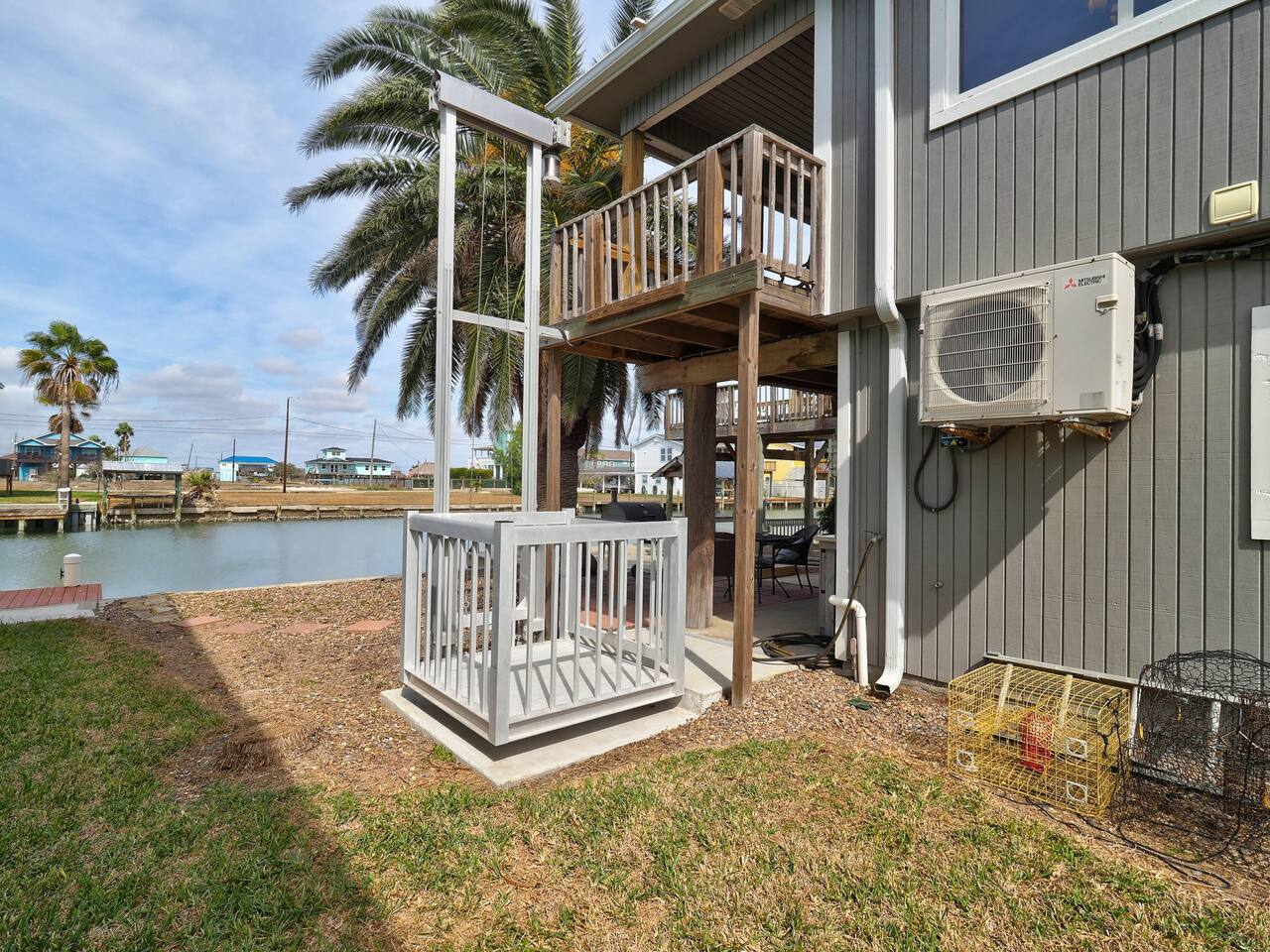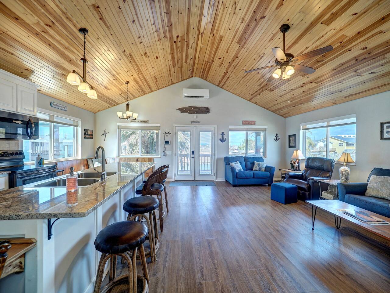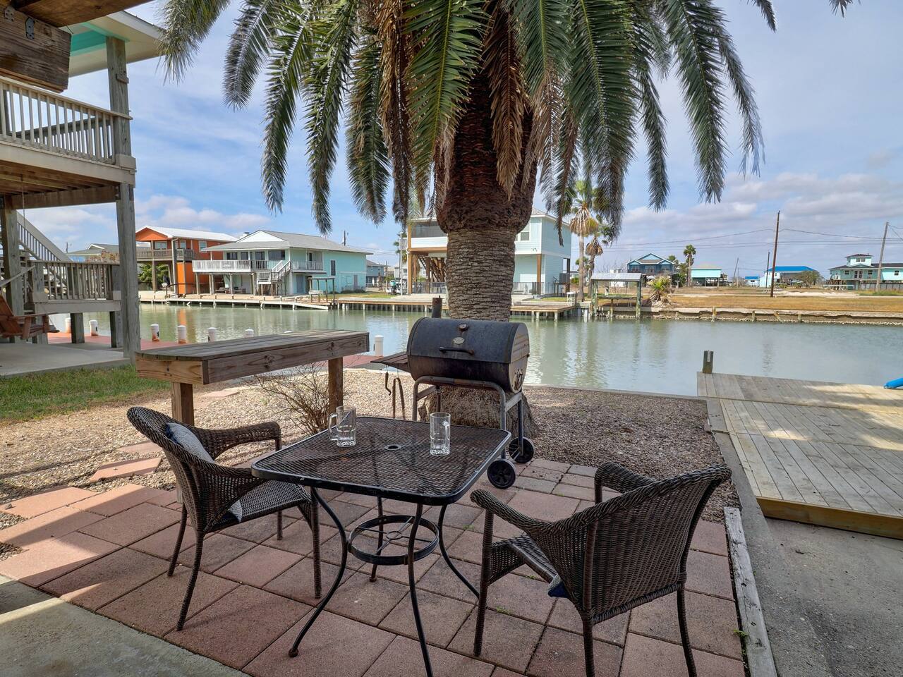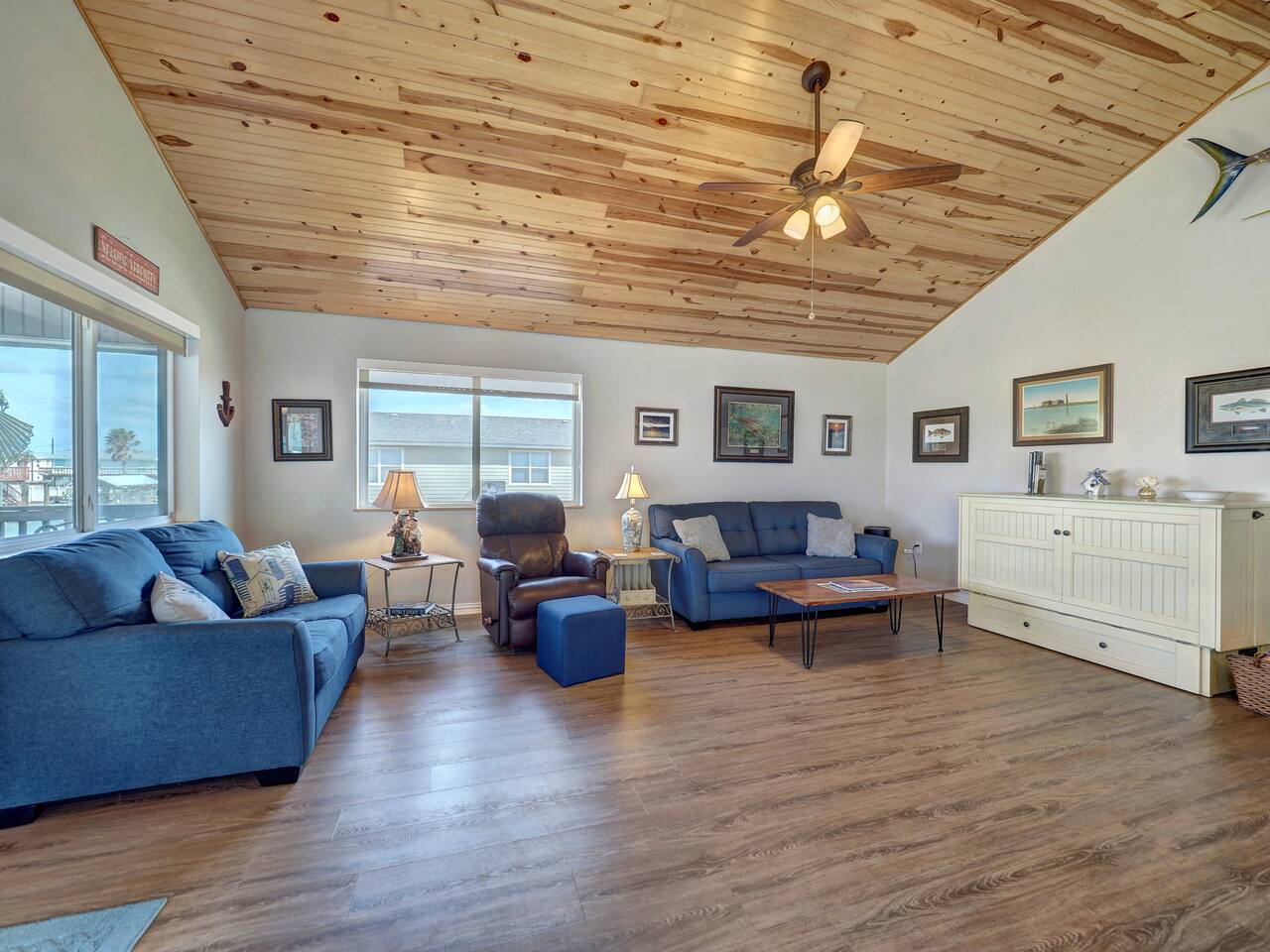 You’ll love the waterfront lifestyle at our beautiful canal-front home. Spend your mornings and evenings on the multiple sky decks overlooking the water, watching wildlife pass by and enjoying peaceful coastal views. For fishing lovers and families alike, the property features a private fishing dock and fish-cleaning station, making it easy for you and the kids to enjoy a day on the water and bring your catch straight back to the house. The outdoor living space is designed for connection and relaxation, with a fully equipped outdoor kitchen, barbecue grill, and plenty of comfortable seating for gathering with friends and family. It’s the perfect setting for sunset dinners, storytelling, and memorable group moments. Downstairs The first level includes a private bedroom with a queen bed and a separate full bathroom, offering a comfortable and convenient space for guests who prefer to avoid stairs. Upstairs Living Area Upstairs you’ll find a spacious living room with vaulted ceilings and an open-concept kitchen, designed for entertaining and spending time together. The open layout allows everyone to stay connected whether cooking, relaxing, or planning the next day’s adventures. Bedrooms The primary bedroom features a king-size bed, large closet, and cozy reading chair, creating a relaxing retreat after a day on the water. The second upstairs bedroom includes two full-size beds, making it perfect for families with kids or groups traveling together. Additional Sleeping Space The large living room also features a queen-size Murphy bed with a comfortable memory foam mattress, providing additional sleeping space while keeping the room open and spacious during the day. Whether you're here to fish, relax on the decks, cook outside, or enjoy time with family and friends, this waterfront home is designed to help you slow down, reconnect, and experience the best of coastal living.