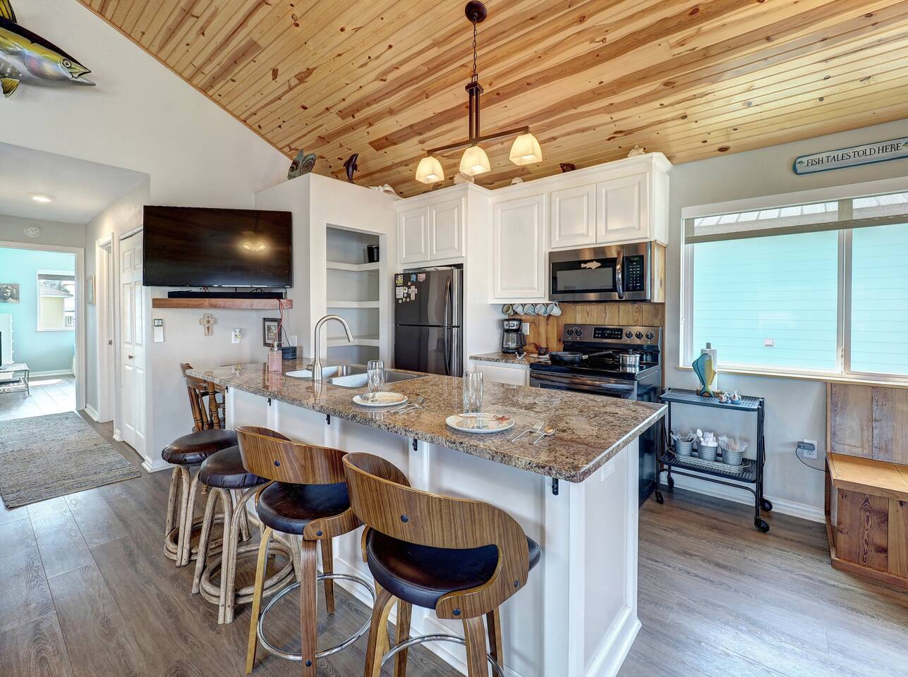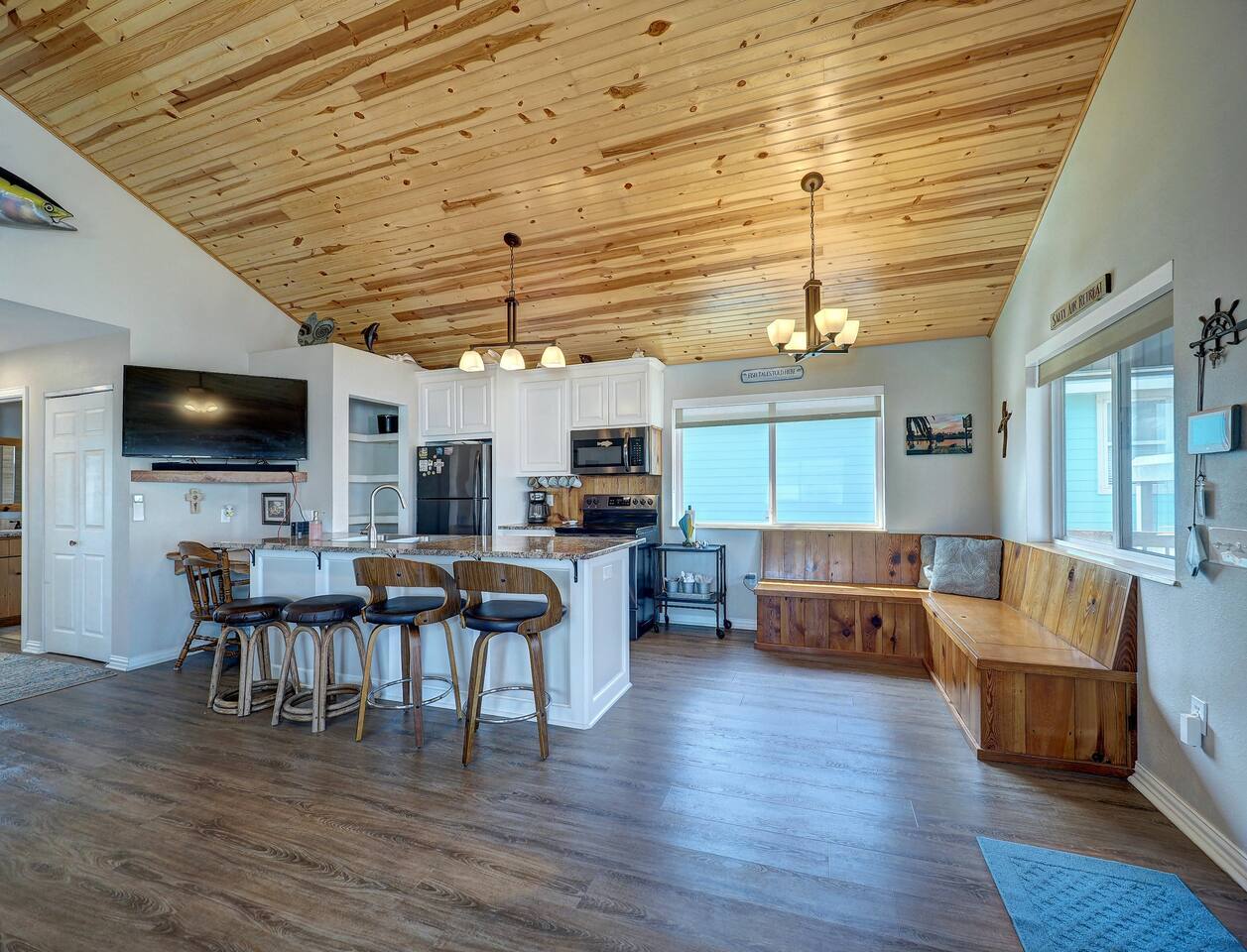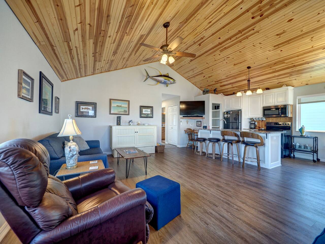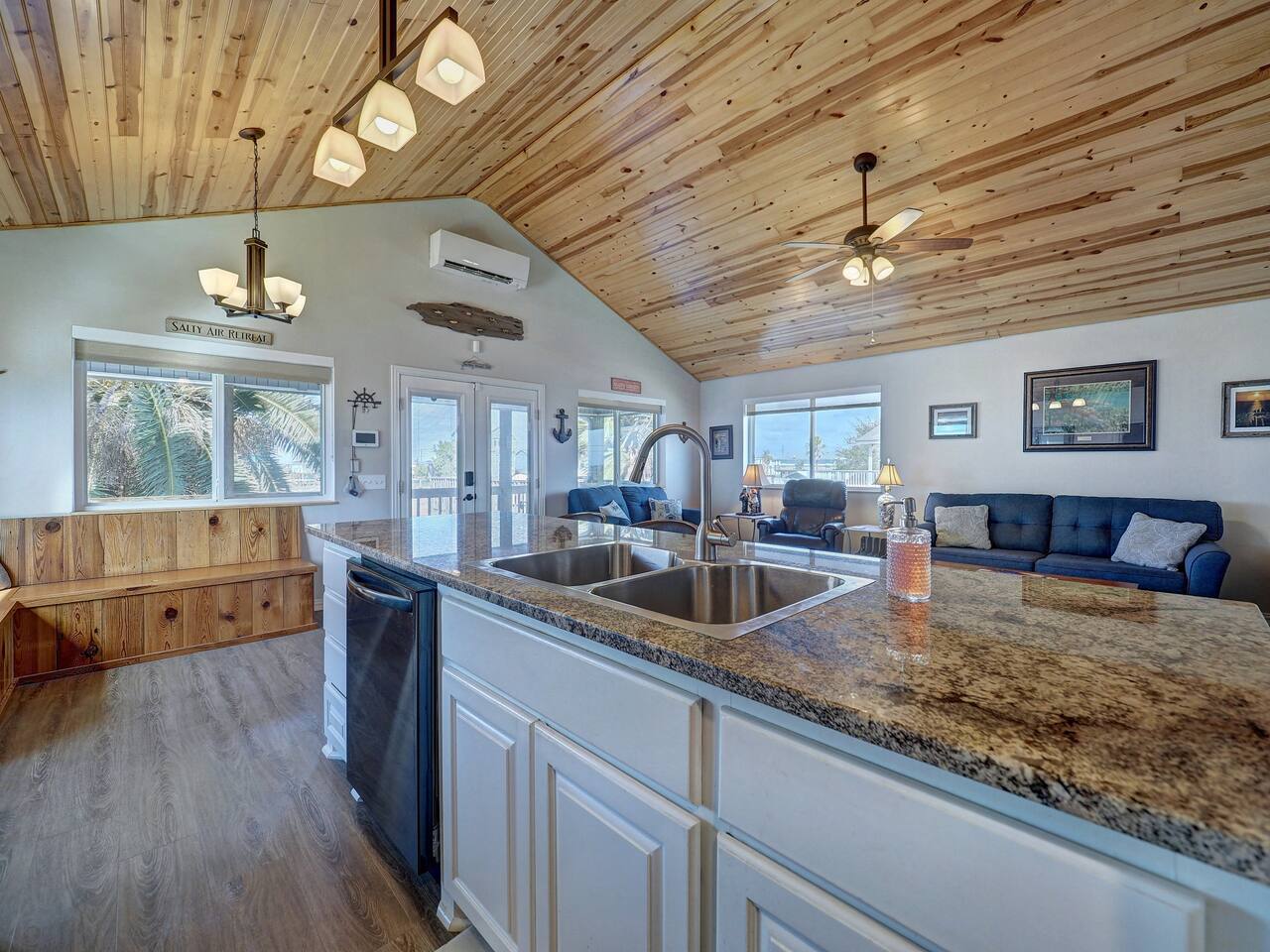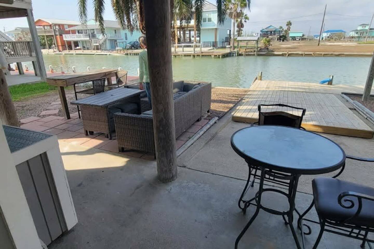You’ll love the waterfront lifestyle at our beautiful canal-front home. Spend your mornings and evenings on the multiple sky decks overlooking the water, watching wildlife pass by and enjoying peaceful coastal views. For fishing lovers and families alike, the property features a private fishing dock and fish-cleaning station, making it easy for you and the kids to enjoy a day on the water and bring your catch straight back to the house. The outdoor living space is designed for connection and relaxation, with a fully equipped outdoor kitchen, barbecue grill, and plenty of comfortable seating for gathering with friends and family. It’s the perfect setting for sunset dinners, storytelling, and memorable group moments. Downstairs The first level includes a private bedroom with a queen bed and a separate full bathroom, offering a comfortable and convenient space for guests who prefer to avoid stairs. Upstairs Living Area Upstairs you’ll find a spacious living room with vaulted ceilings and an open-concept kitchen, designed for entertaining and spending time together. The open layout allows everyone to stay connected whether cooking, relaxing, or planning the next day’s adventures. Bedrooms The primary bedroom features a king-size bed, large closet, and cozy reading chair, creating a relaxing retreat after a day on the water. The second upstairs bedroom includes two full-size beds, making it perfect for families with kids or groups traveling together. Additional Sleeping Space The large living room also features a queen-size Murphy bed with a comfortable memory foam mattress, providing additional sleeping space while keeping the room open and spacious during the day. Whether you're here to fish, relax on the decks, cook outside, or enjoy time with family and friends, this waterfront home is designed to help you slow down, reconnect, and experience the best of coastal living.